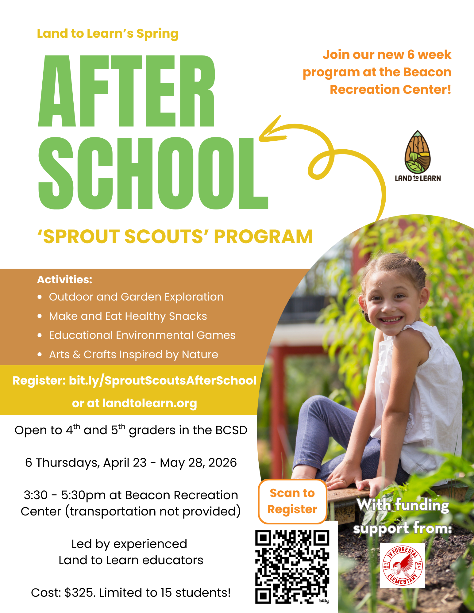 Registration now open for Land to Learn’s 6 week after-school program at the Beacon Recreation Center! Accepting 4th & 5th Graders enrolled in Beacon City School District. $325 for 6 sessions on Thursdays April 23 - May 28, 3:30 - 5:30pm.