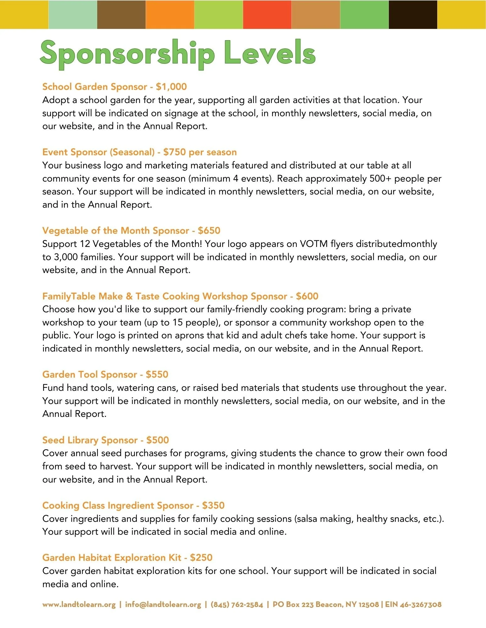 Your business can help create unforgettable moments: when children watch their seeds sprout, marvel at butterflies in their garden, and discover the satisfaction of preparing healthy snacks as a team. Find a sponsorship level that works best for you and reach out to discuss how you can show your support!